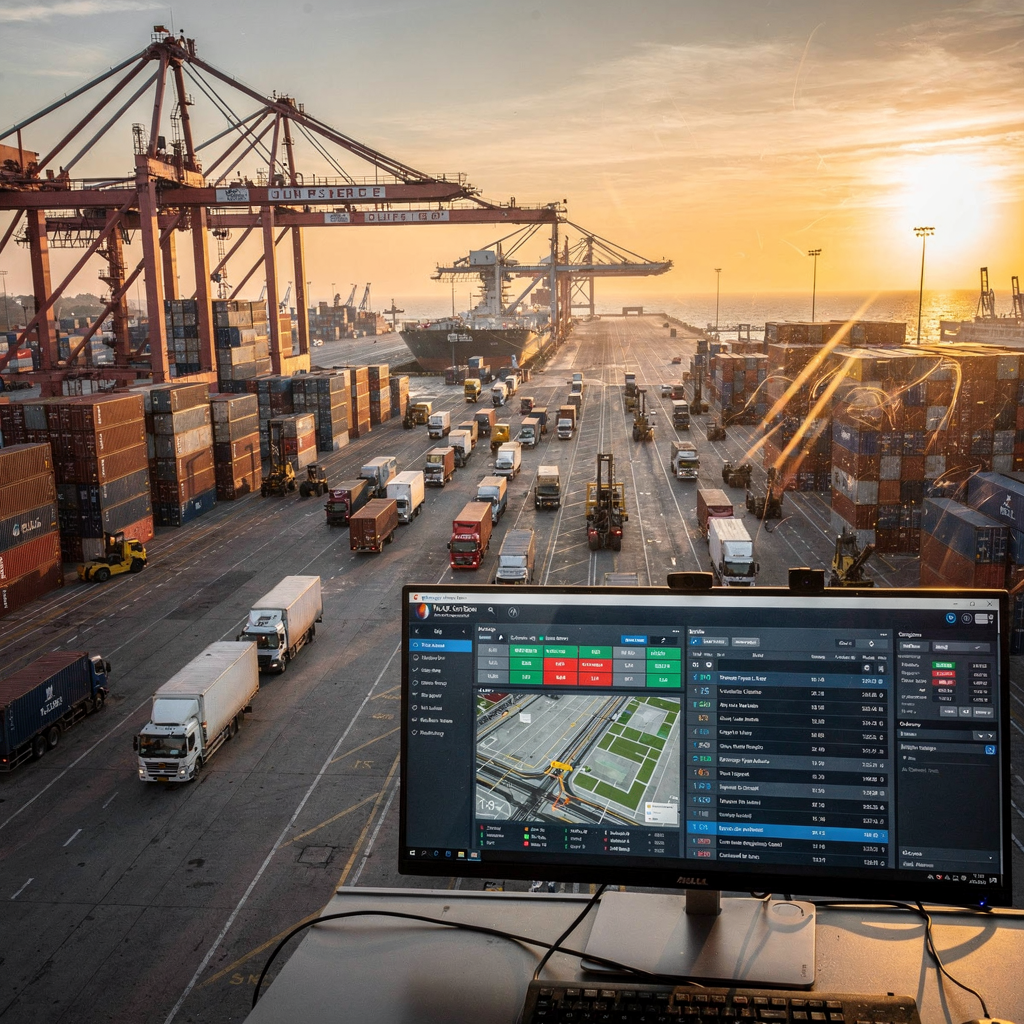 A busy container terminal yard at sunrise showing stacked containers, quayside cranes, trucks in lanes, and a control room screen displaying real-time schedules and maps (no text or numbers in image)